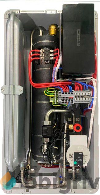Передняя панель корпуса оформлена в современном стиле. Это позволяет использовать котел, не скрывая его в шкафах и подвалах, а делать элементом интерьера. На передней части корпуса размещен сенсорный экран для управления. Он имеет высокий уровень отклика и упрощает взаимодействие с электрокотлом. На экране отображается текущее состояние температуры выбранного теплового датчика. Плато управления расположено в отдельном отсеке и защищено дополнительным изолирующим слоем.