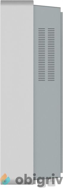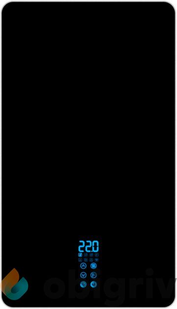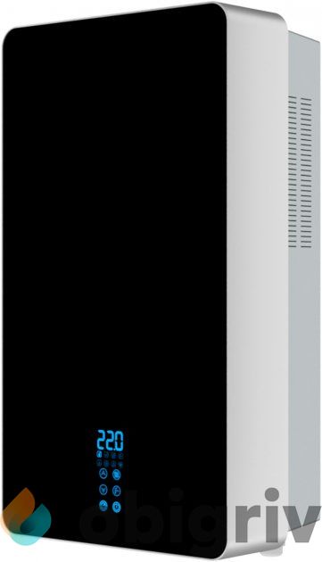 Передняя панель корпуса оформлена в современном стиле. Это позволяет использовать котел, не скрывая его в шкафах и подвалах, а делать элементом интерьера. На передней части корпуса размещен сенсорный экран для управления. Он имеет высокий уровень отклика и упрощает взаимодействие с электрокотлом. На экране отображается текущее состояние температуры выбранного теплового датчика. Плато управления расположено в отдельном отсеке и защищено дополнительным изолирующим слоем.