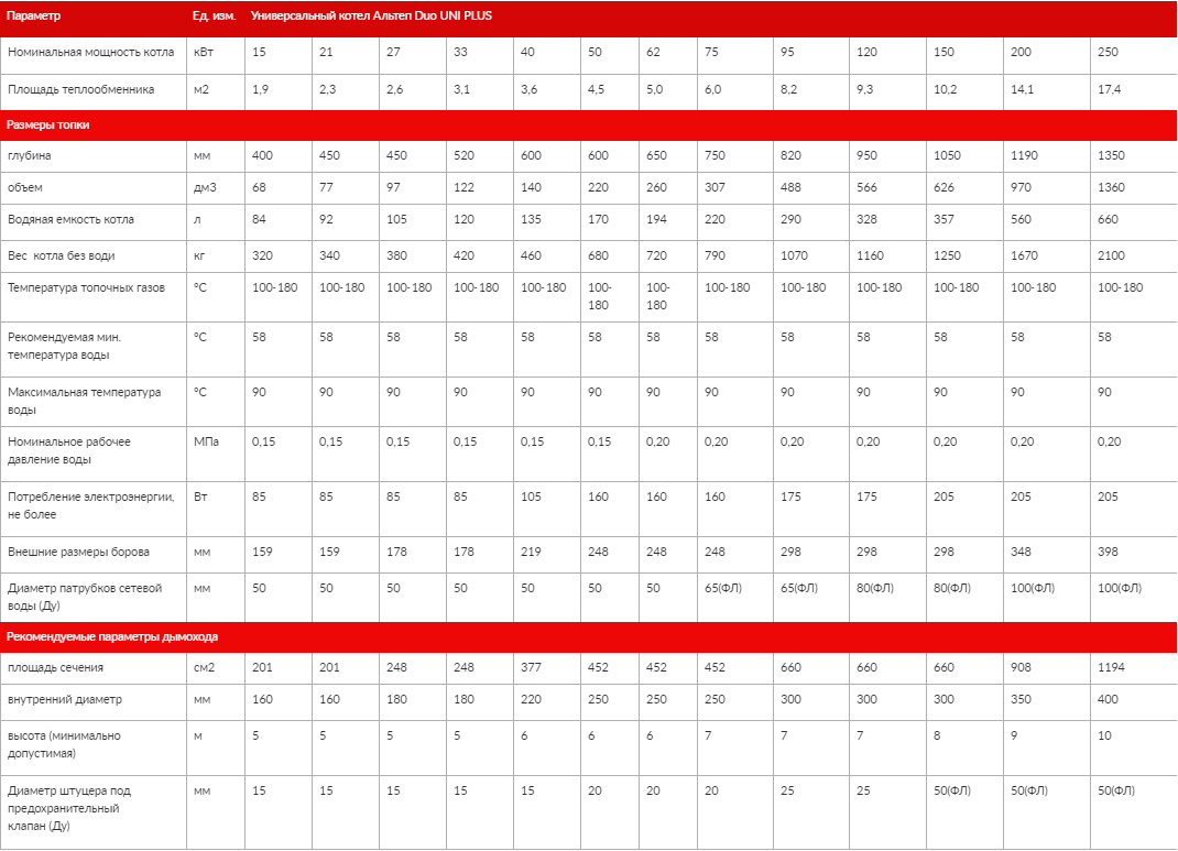 ТЕХНИЧЕСКИЕ ХАРАКТЕРИСТИКИ ДЛЯ СЕРИИ КОТЛОВ ДЛИТЕЛЬНОГО ГОРЕНИЯ ALTEP DUO UNI/DUO UNI PLUS