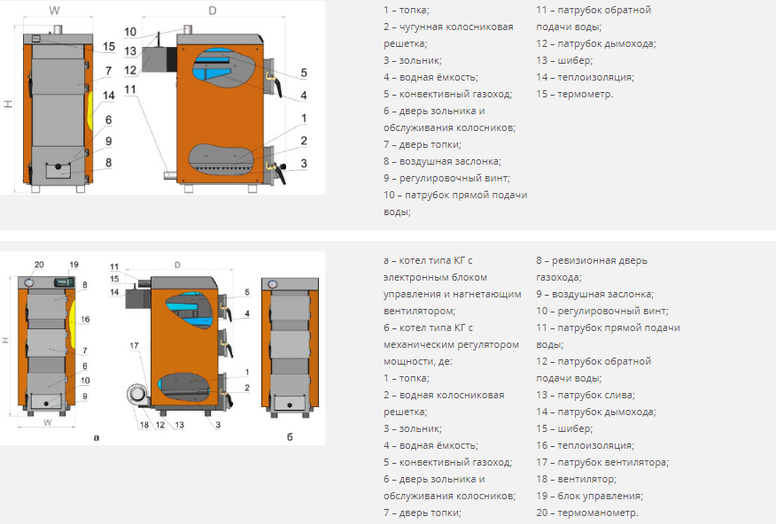 Котлы отопительные твердотопливные водонагревательные стальные модели КГ с горизонтальным расположениям каналов газохода используются для обогрева различных помещений, в системах отопления с естественной (гравитационной) либо принудительной циркуляцией теплоносителя. Котлы универсальные, разработаны для сжигания различного вида топлива (это могут быть различные древесные, угольные и остальные виды твердого топлива), которое более доступно потребителю в зависимости от региона, где котел будет установлен. Горизонтальные каналы газохода, а так же водные колосники увеличивают площадь поглощения тепловой энергии, которая выделяется в следствии сжигания топлива, что обеспечивает высокую экономичность, а также эффективность котла.