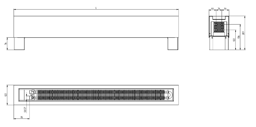 В корпусе 4FRH установлены четырехтрубные теплообменники с использованием медной трубы диаметром 12 мм и толщиной стенки 1мм. Все теплообменники производятся и проходят выходной контроль на производстве. Состоит из высококачественных компонентов (медь и алюминий) европейских производителей. Компактный и продуманный конструктив теплообменника позволят обеспечивать теплом большую площадь помещений. Так же несет функцию ребер жесткости благодаря кассетному исполнению креплений и опор теплообменника и легко обслуживается благодаря съемному кожуху конвектора. Возможно увеличение теплопродуктивности за счет 2х и 3х теплообменников, с горизонтальным расположением.