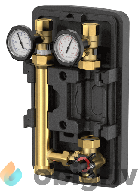 Полный комплект без циркуляционного насоса (монтажная длина 180 мм); два шаровых крана (с обратным клапаном в обратной линии); два контактных термометра встроенные в ручку шарового крана (диапазон 0 – 120 °C); 3-ходовой смеситель с настраиваемым байпасом; EPP изоляция; нижние соединения 1 ½" M плоское уплотнение, верхние соединения с внутренней резьбой согласно размерам насоса; настенный кронштейн.