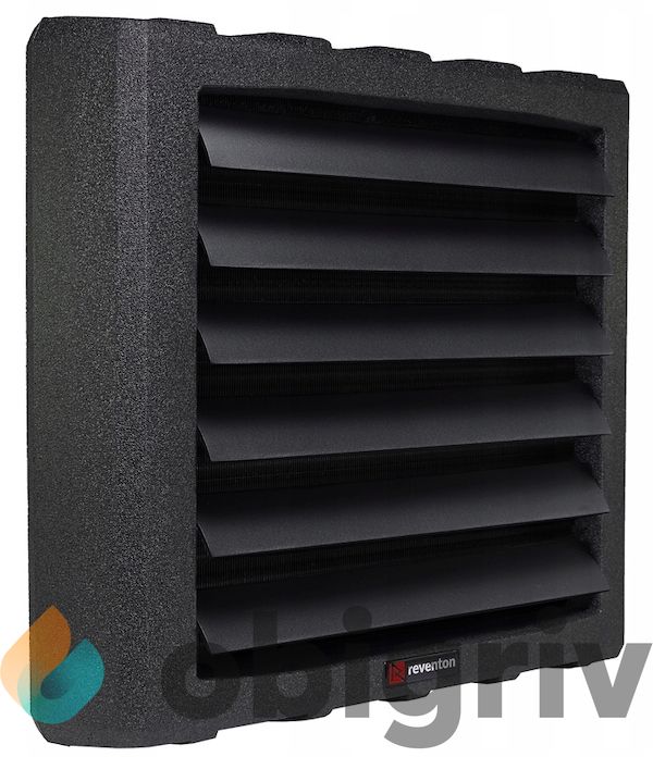 Тепловентилятор водяной Reventon в зависимости от тепловой мощности, имеют 1,2 и 3-х рядный теплообменник. Для нормальной работы агрегата нет необходимости подводить подготовленный воздух, осевой вентилятор берет воздух помещения и пропускает его через теплообменник нагретый водой. Источник тепла для подогрева воды может быть разным, от котла(твердотопливного, газового, электрического) до центральной теплосети. Температура теплоносителя для тепловентиляторов Reventon может составлять от +40ºС горячей воды до +110 ºС насыщенного пара. Впрочем тепловентилятор работает и на охлаждение в паре с чиллером.