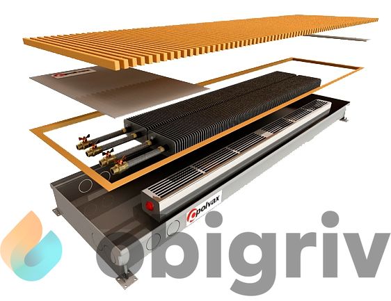 Polvax серии KV - энергосберегающие внутрипольные конвекторы (обогреватели) принудительной конвекции, которые монтируются в пол. Данная серия с повышенной теплоотдачей, теплоноситель - вода или подготовленные растворы. Конструкция дополнена электровентилятором Standart (переменного тока 12 V), но при этом они совершенно бесшумные при работе. Конструктивно состоят из короба (корпус конвектора), в котором находится закрепленный на кронштейнах теплообменник. При этом помещение нагревается постепенно и равномерно. Могут использоваться и как основной источник отопления, так и дополнительный, также используются для отсечения холодного воздуха, поступающего из оконных проемов. Если Вы монтируете в пол данный конвектор, обязательно к нему нужно докупить трансформатор, термостат и, по желанию, регулятор частоты вращения, без него ваш обогреватель будет работать на максимальной скорости.